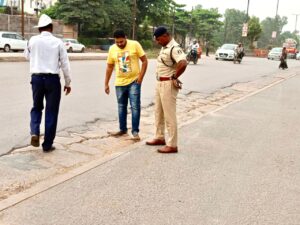 निर्माण कार्य के दौरान *उप पुलिस अधीक्षक (यातायात)* द्वारा निर्माण कंपनी को सेफ्टी उपकरणों का प्रयोग करने वाहन डायवर्ट करने के लिए सुरक्षा गार्ड तैनात करने रात्रि के समय उचित प्रकाश व्यवस्था रखने हेतु निर्देश दिए गए साथ ही आम नागरिकों से अपील की है की सावधानी पूर्वक वाहन चलाएं।