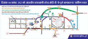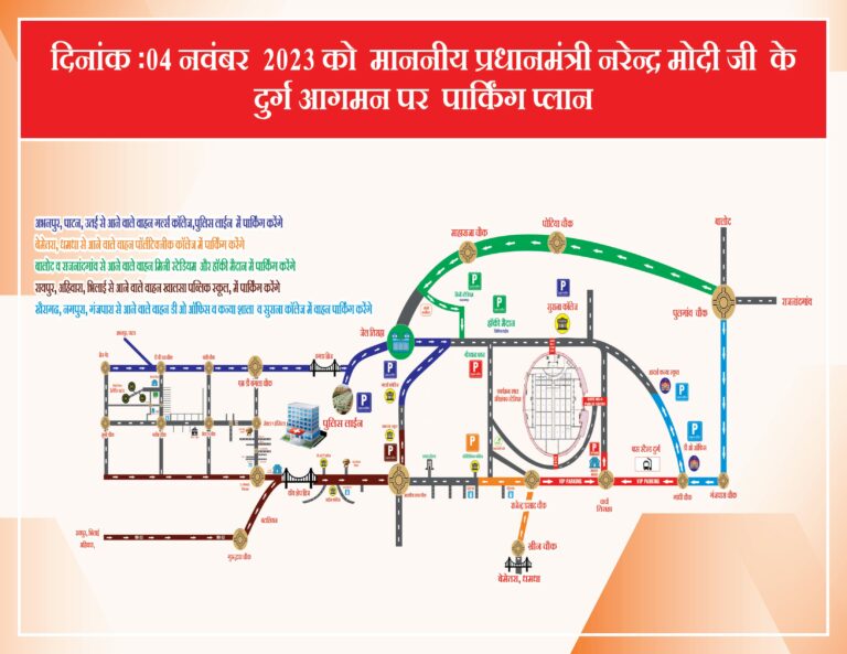 दिनांक 04 नवबंर 2023 को माननीय श्री नरेन्द्र मोदी, प्रधानमंत्री भारत सरकार के दुर्ग छ.ग. आगमन पर दुर्ग पुलिस द्वारा पार्किग प्लान एवं रूट के संबंध में एडवाइज़री