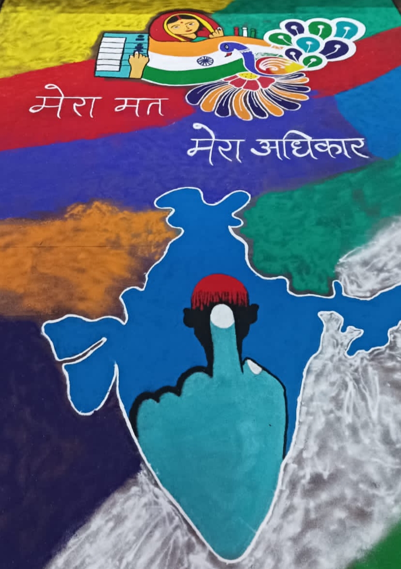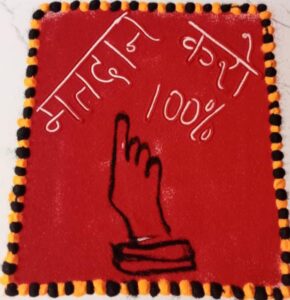 शहर क्षेत्र रहवासियों ने अपने घर के आंगन में मतदान जागरूकता के लिए खुबसूरत रंगोली बनाई: