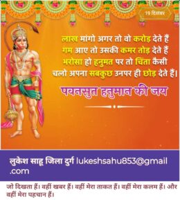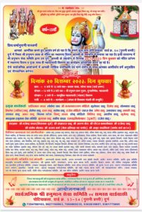 दिनांक 20 दिसम्बर 2023, बुधवार प्रातः 9 बजे से 12 बजे तक दोपहर – 12 बजे से 2 बजे तक कलश यात्रा, शोभा यात्रा (वार्ड भ्रमण) श्री हनुमान हवन पूजन, दुग्धाभिषेक, महाआरती दोपहर 2 बजे से सामूहिक महाप्रसादी (भंडारा) वितरण रात्री – 8 बजे से कार्यक्रम (अंचल के विख्यात मंडली की प्रस्तुति)