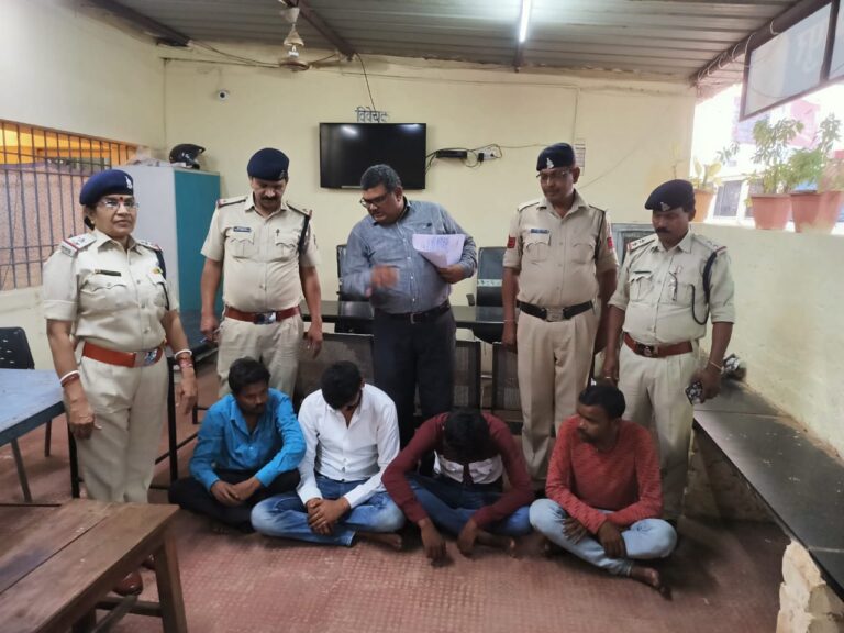 नाम आरोपी (01) अमित मिश्रा पिता राजेन्द्र मिश्रा उम्र 29 साल साकिन एलआईजी 251 बोरसी, चौकी पद्मनाभपुर दुर्ग (02) कृष्णा यादव पिता रामजी यादव उम्र 21 साल साकिन वृन्दा नगर चौक बोरसी चौकी पदमनानपुर दुर्ग (03) रूपेन्द्र यादव पिता स्व मणीराम यादव उम्र 32 साल साकिन अटल आवास बोरसी, चौकी दुर्ग (04) राजू यादव पिता बहाल यादव उम्र 40 साल साकिन वार्ड नं 44 सुलभ शौचालय के पास कसारीडीह दुर्ग