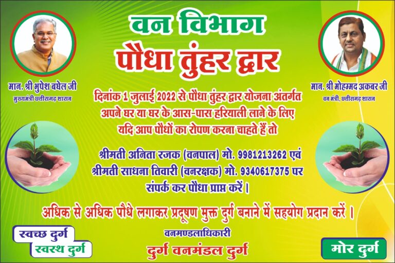 दुर्ग 28 जून 2022/6 जुलाई 2022 “वन हम वन ट्री” के दिन सभी के हाथों में धरती का श्रृंगार करने के लिए एक पौधा हो इसी उद्देश्य से वन विभाग दिनांक 1 जुलाई 2022 से पौधा तुंहर द्वार योजना अंतर्गत जिले वासियों को उनके घर के द्वार पर पौधा उपलब्ध कराएगा।