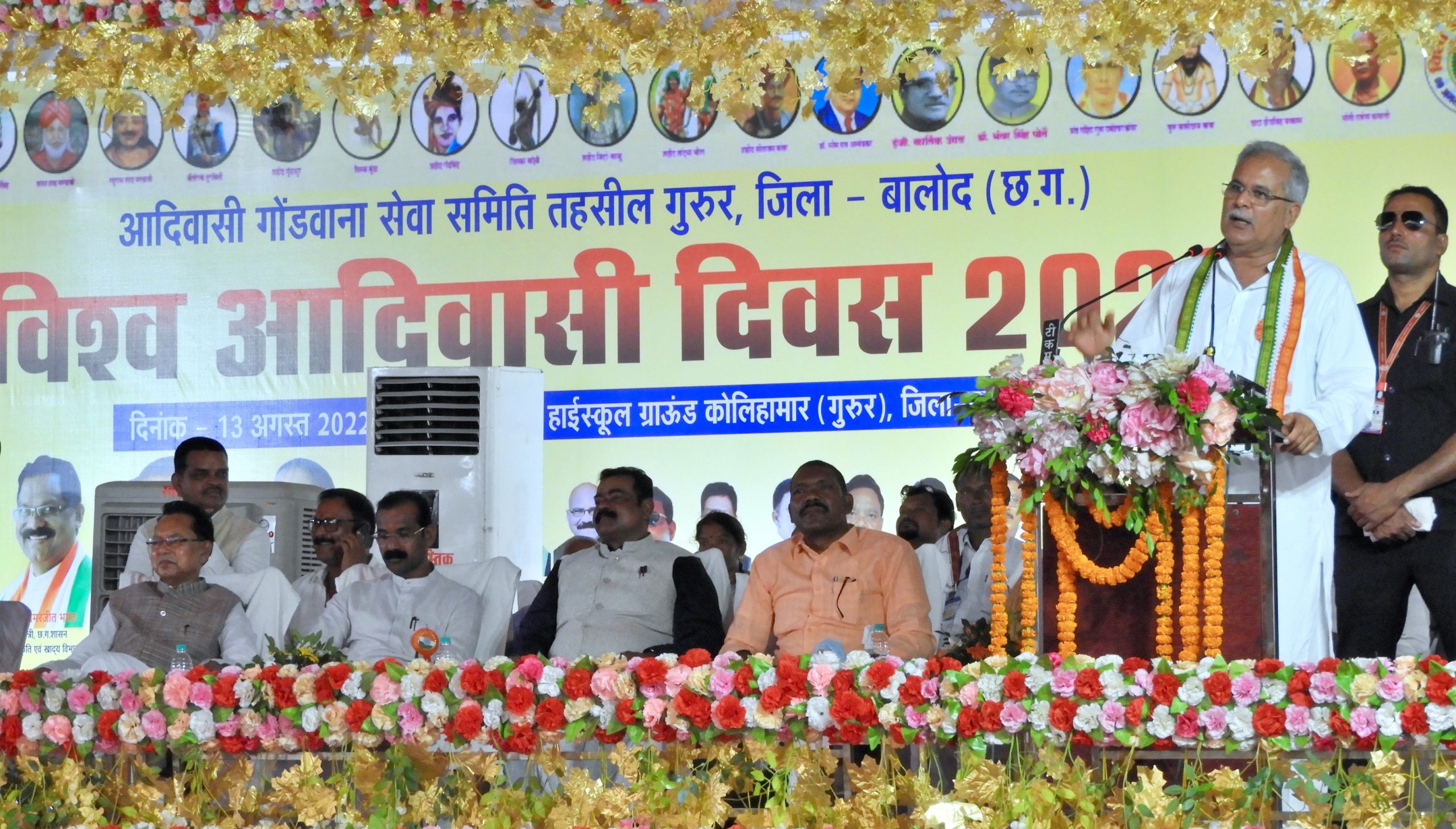 मुख्यमंत्री बघेल आज बालोद जिले के गुरूर विकासखण्ड के ग्राम कोलिहामार में आदिवासी गोंड़वाना सेवा समिति तहसील गुरूर द्वारा आयोजित विश्व आदिवासी दिवस समारोह के अवसर पर अपना उद्गार व्यक्त कर रहे थे। बघेल कार्यक्रम में मुख्य अतिथि के रूप में उपस्थित थे।