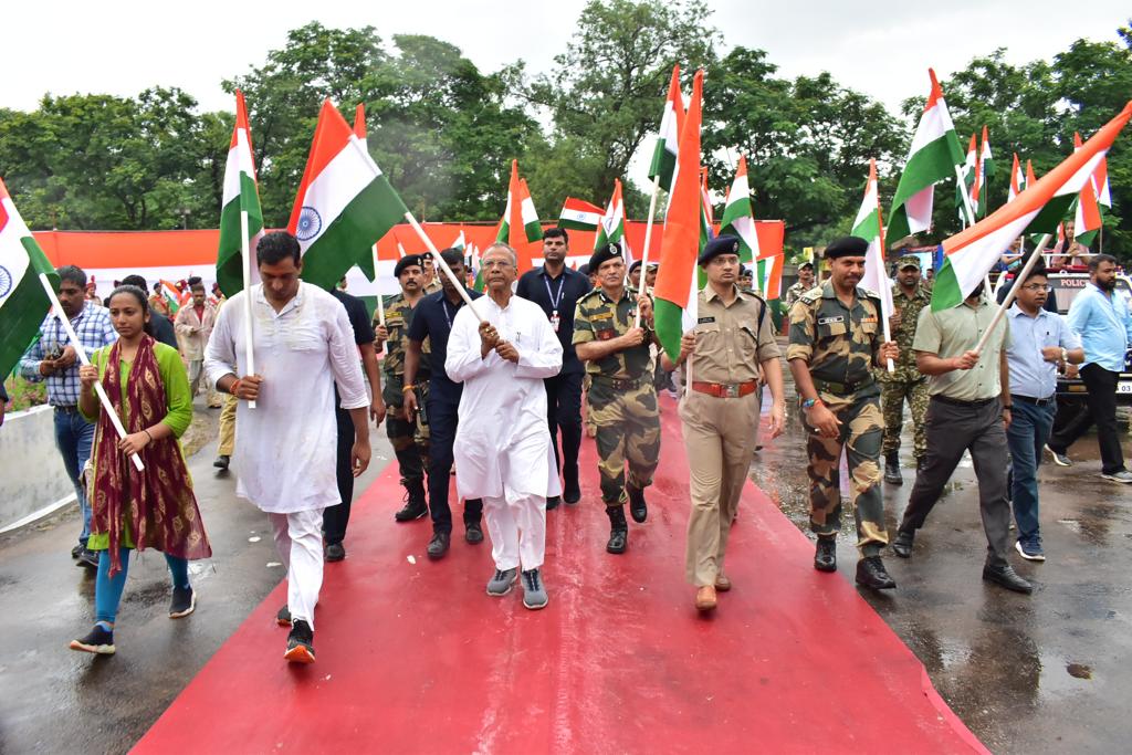माननीय मुख्य अतिथि महोदय के साथ माननीय सांसद विजय बघेल, माननीय विधायक दुर्ग अरुण वोरा, माननीय विधायक भिलाई नगर श्री देवेंद्र यादव, माननीय महापौर दुर्ग धीरज बाकलीवाल, कलेक्टर दुर्ग पुष्पेंद्र कुमार मीणा, पुलिस अधीक्षक दुर्ग डॉक्टर अभिषेक पल्लव के साथ समस्त राजपत्रित अधिकारी पुलिस के सैकड़ों जवान एवं बीएसएफ के जवान व मीडिया कर्मी ने राष्ट्रीय ध्वज लेकर पैदल मार्च निकाला।