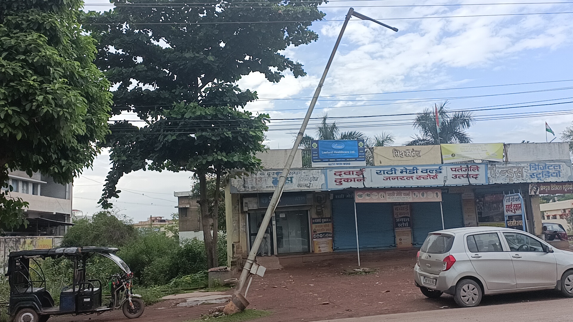 बीजली पोल खंभे को रात्रि के समय किसी वाहन के ठोकर से वह बीजली पोल के खंभे क्षतिग्रस्त होने के कारण बेंड होकर एक साईड झुक गया हैं।