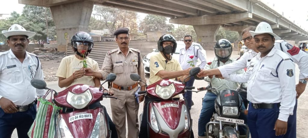 दिनांक 02.09.2022 को *डॉ. अभिषेक पल्लव, पुलिस अधीक्षक दुर्ग के जन्म दिवस के अवसर पर यातायात पुलिस के समस्त अधिकारियों एवं कर्मचारियों द्वारा जिले के 15 चौक चौराहों पर यातायात के नियमों का पालन कर वाहन चलाने वाले कुल-4000 वाहन चालको को गुलाब फूल देकर सम्मानित किया गया